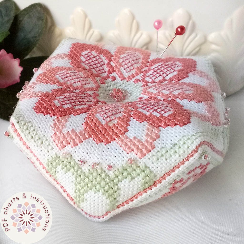 This product is a set of PDF files containing the Azalea Biscornu cross stitch pattern and assembly instructions. It is not a finished product. Fabric, threads, and other materials are not included. The finished biscornu shown in the photos is for illustration purposes only.