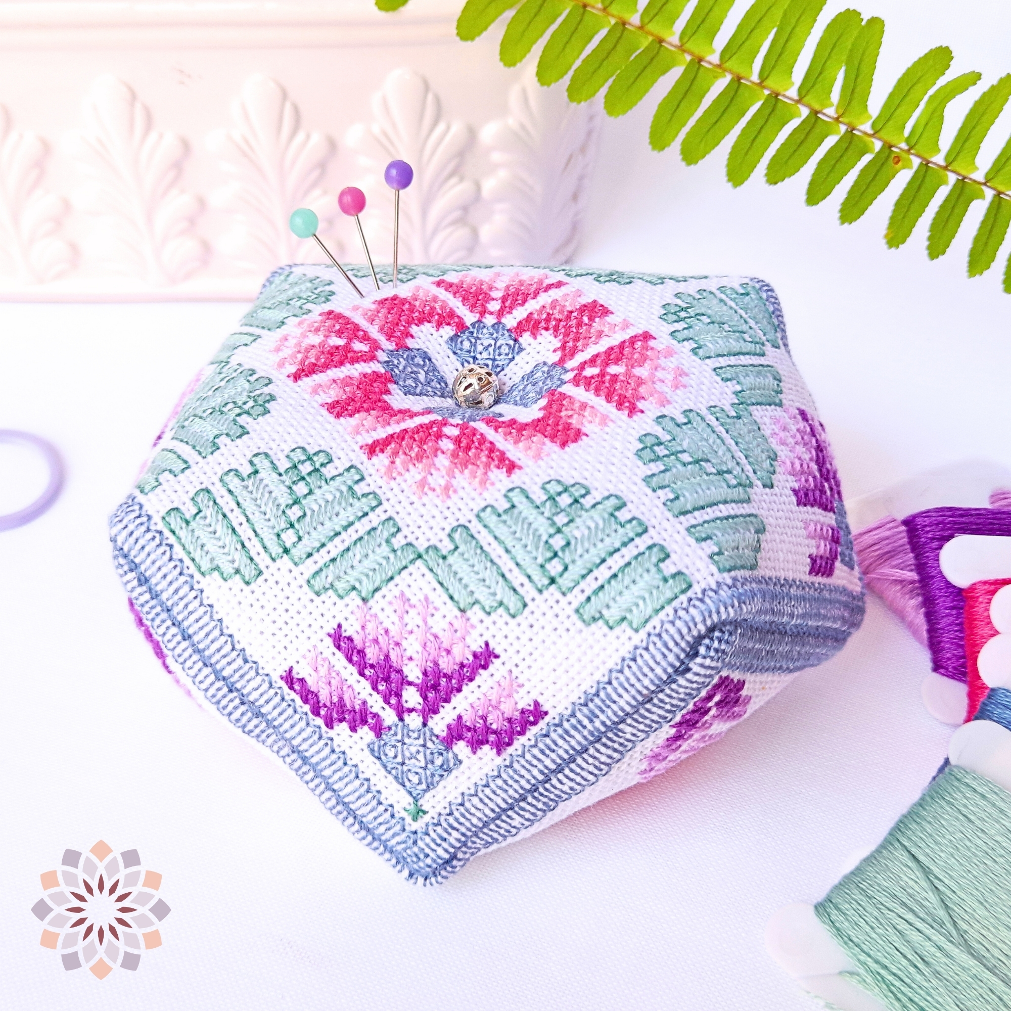 – A guide to special stitches and step-by-step photos for assembling the biscornu.