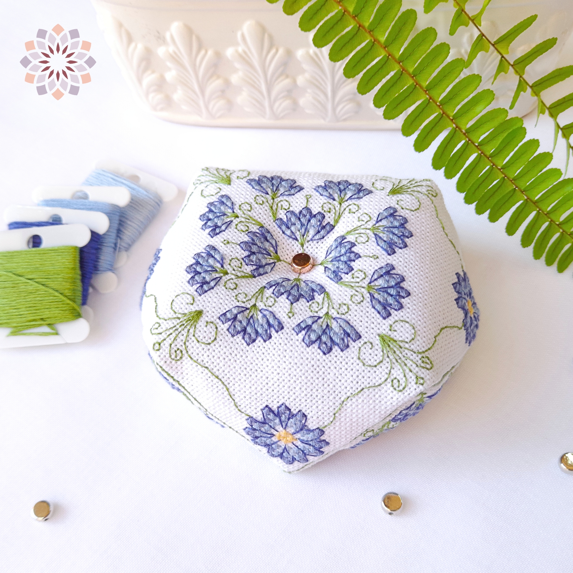 💙 The Cupid’s Dart Biscornu cross stitch pattern brings fresh blue wildflowers to life in thread, a refined embroidery design for an elegant pincushion and peaceful stitching time.