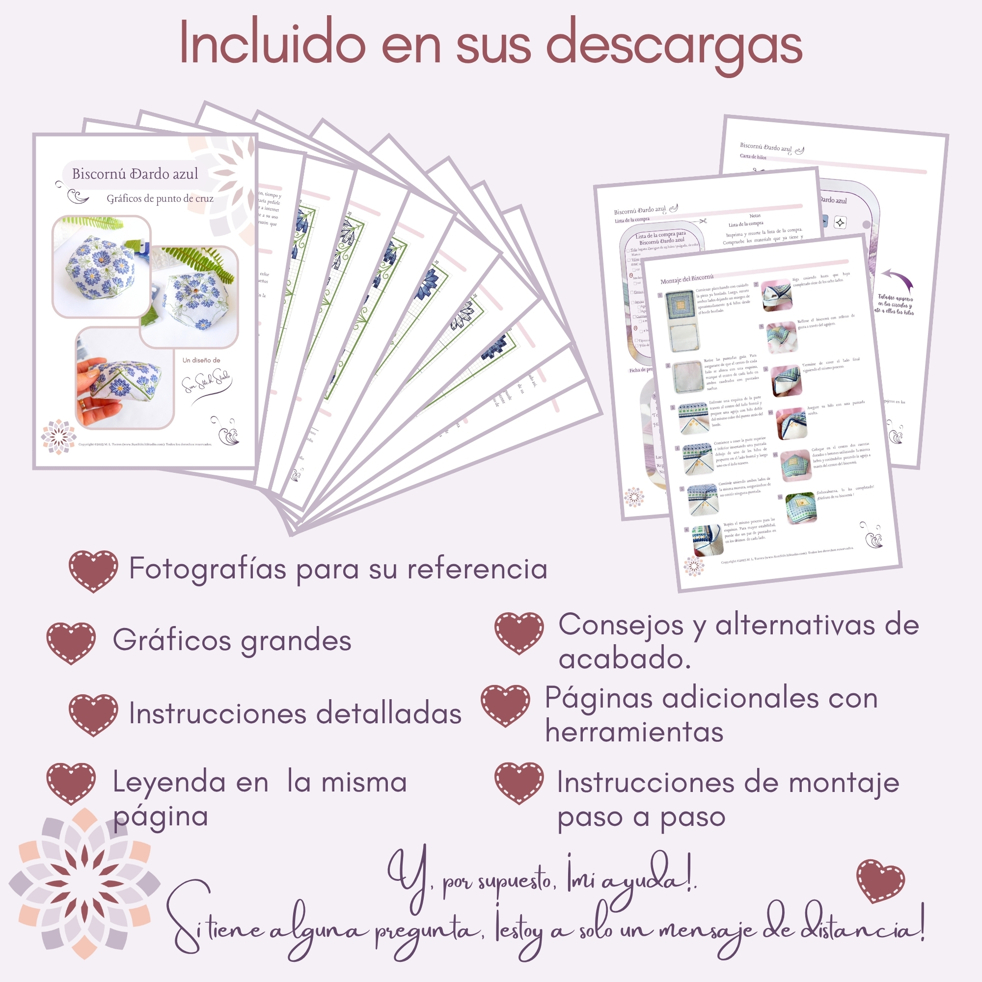 • Step-by-step instructions to assemble the biscornu, with a video tutorial link