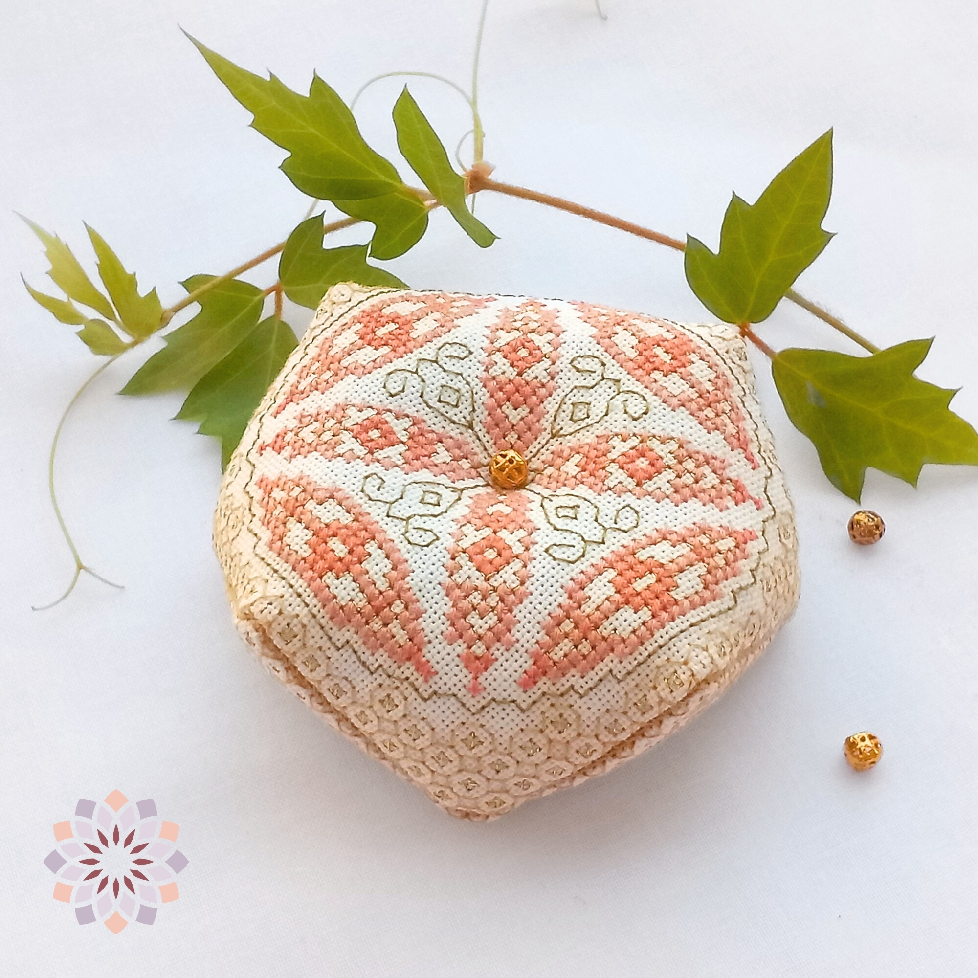This product is a set of PDF files containing the Dawn Biscornu cross stitch pattern and assembly instructions. It is not a finished product. Fabric, threads, and other materials are not included. The finished biscornu shown in the photos is for illustration purposes only.