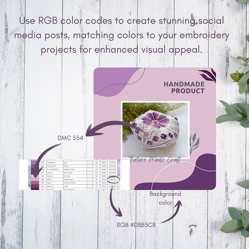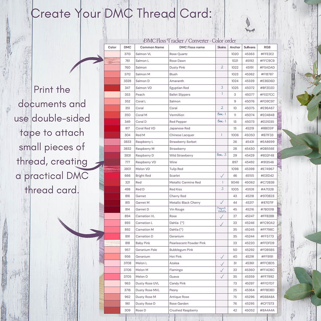 🔹️ 3 PDF files featuring all 500 shades of DMC 6-strand embroidery floss, including both new and discontinued colors (clearly marked), with conversions to Anchor and Sullivans (not the other way around). These include: