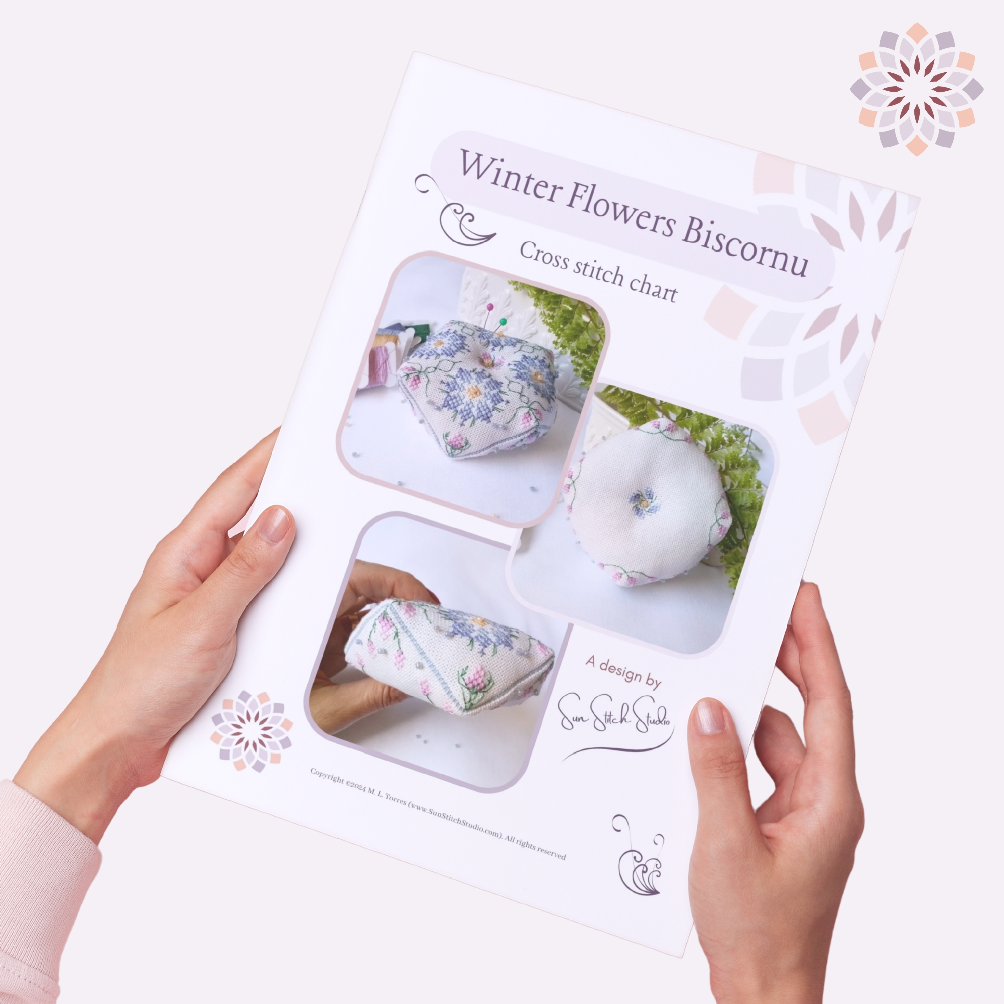 This product is a set of PDF files containing the Winter Flowers Biscornu cross stitch pattern and assembly instructions. It is not a finished product. Fabric, threads, and other materials are not included. The finished biscornu shown in the photos is for illustration purposes only.