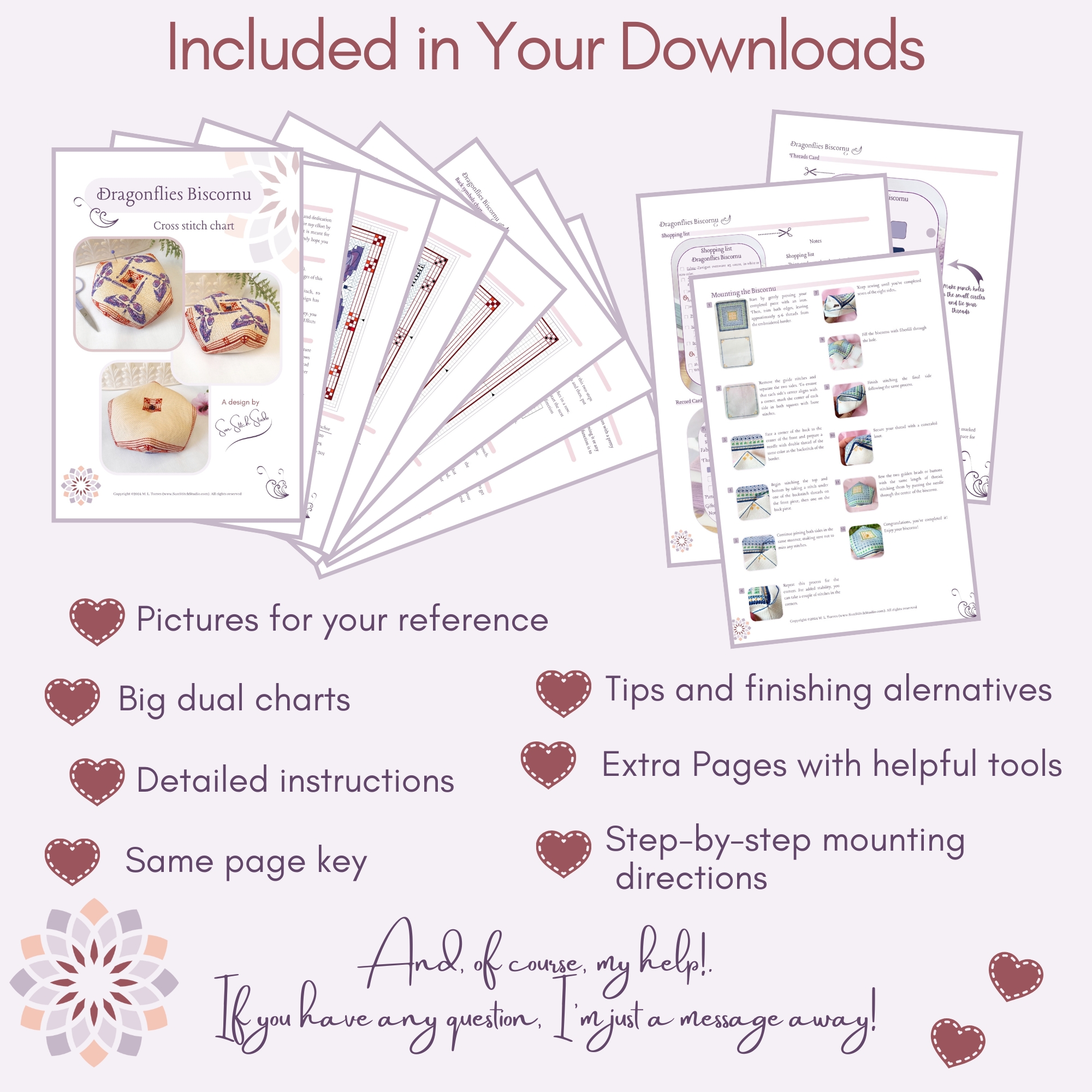 - Vous pouvez vendre le biscornu une fois terminé, à condition de mentionner la source : Sun Stitch Studio (M. L. Torres – www.SunStitchStudio.com).