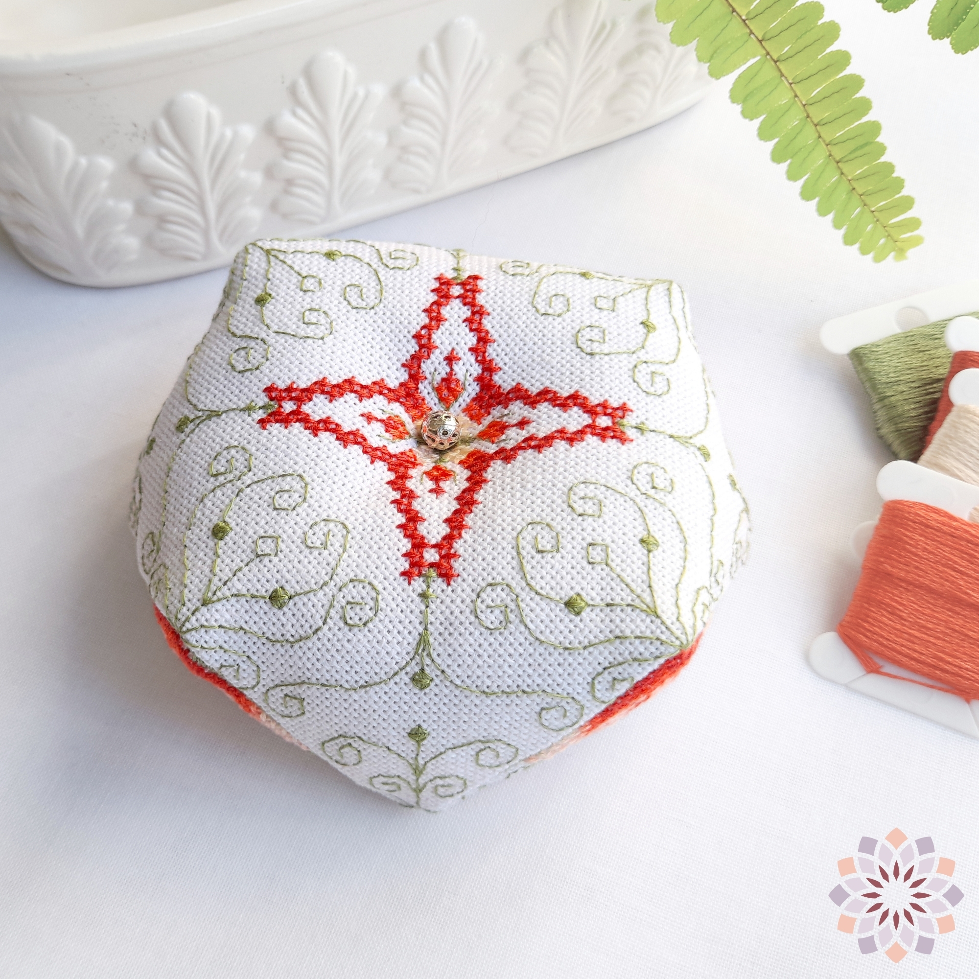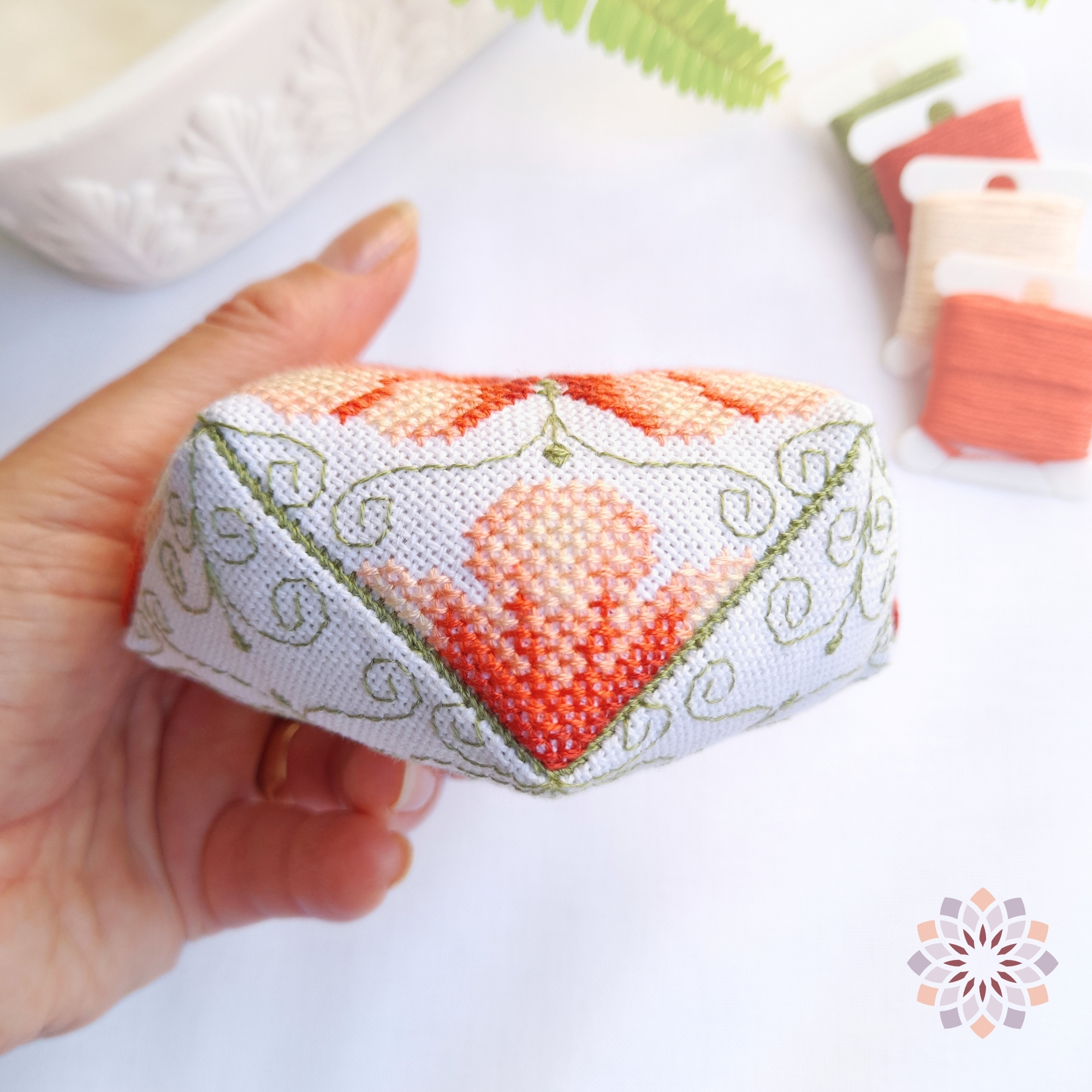 Este producto es un patrón digital en formato PDF con las instrucciones completas para bordar y montar el Biscornú Calanchoe.