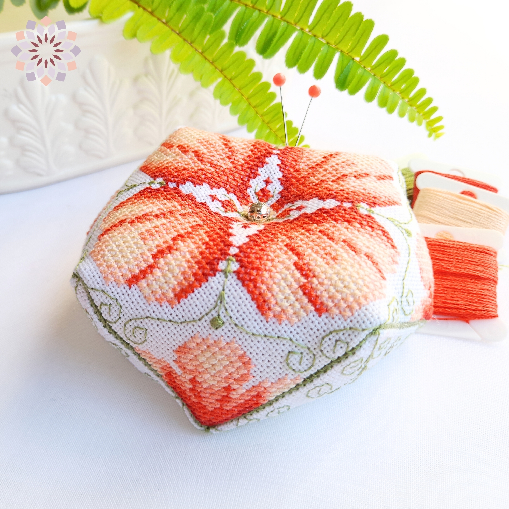 El patrón de punto de cruz para Biscornú Calanchoe es un proyecto floral sereno y equilibrado, pensado para disfrutar de su tiempo de bordado.