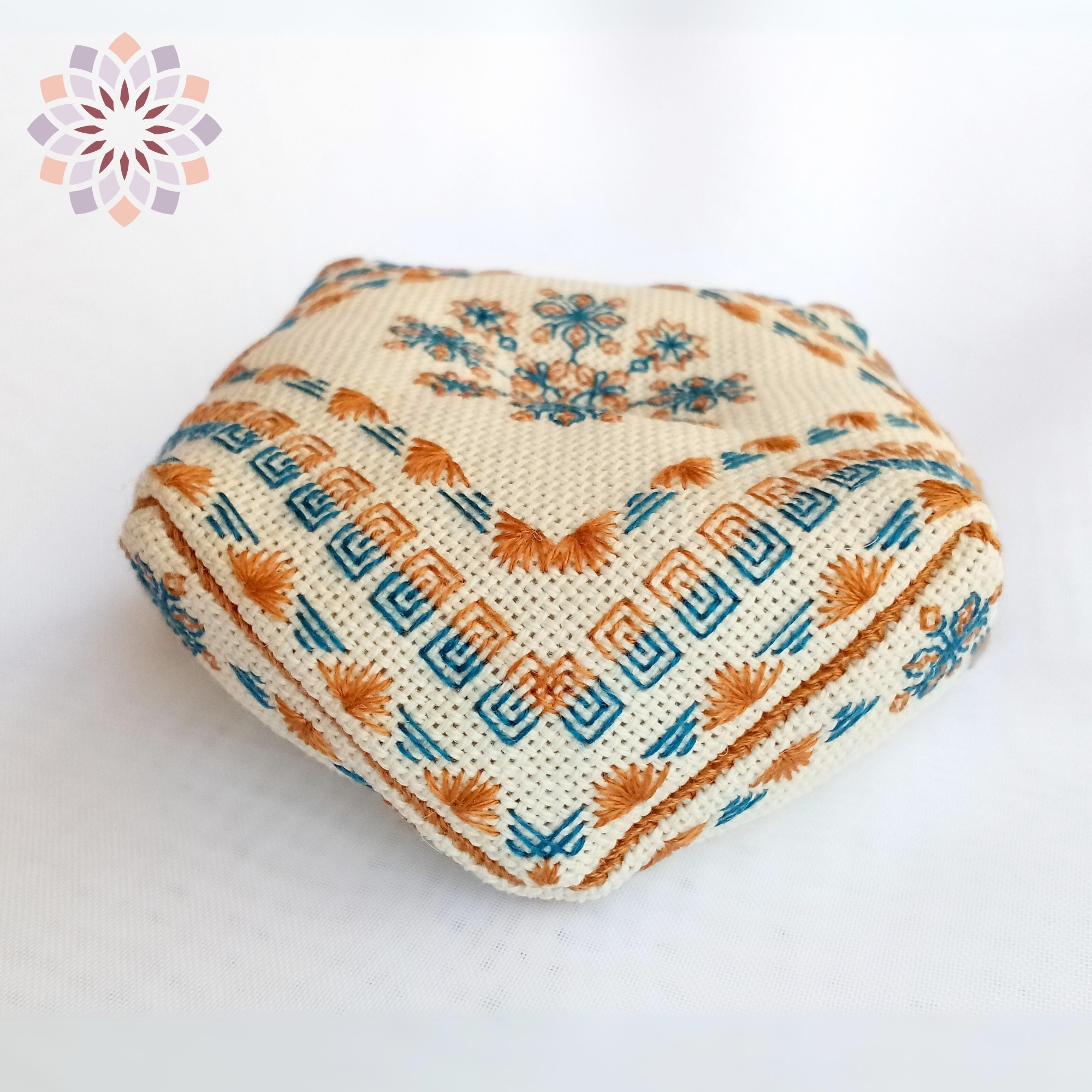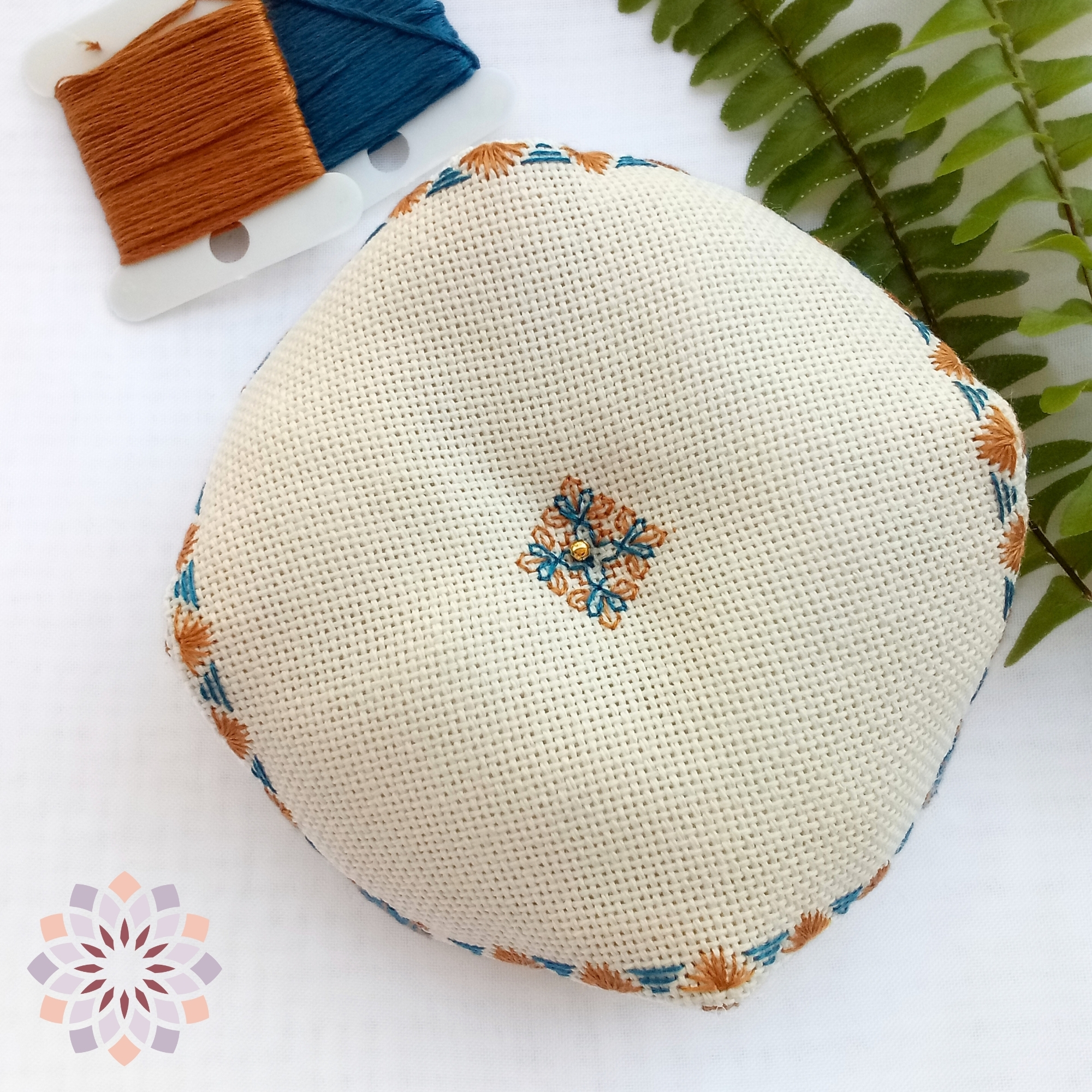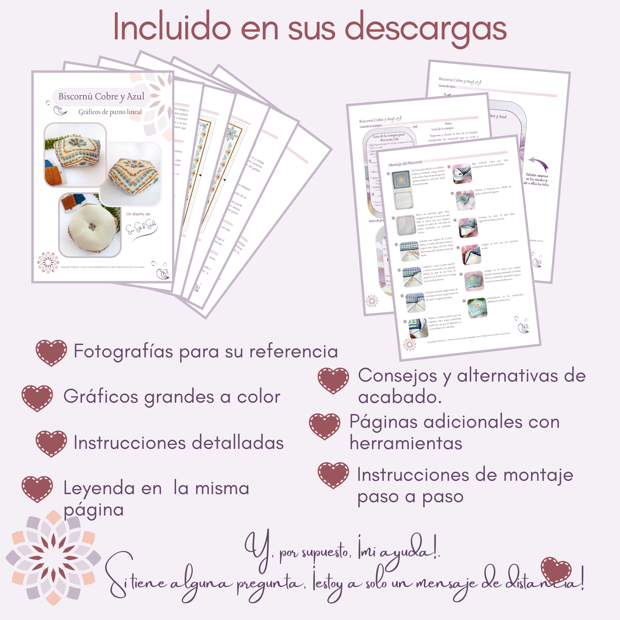 Este producto consiste en un conjunto de archivos PDF del patrón de bordado del Biscornú Cobre y Azul y las instrucciones para realizarlo, no el producto terminado. No incluye tela, hilos ni otros materiales. El biscornú terminado que se muestra en las fotos tiene solo fines ilustrativos.