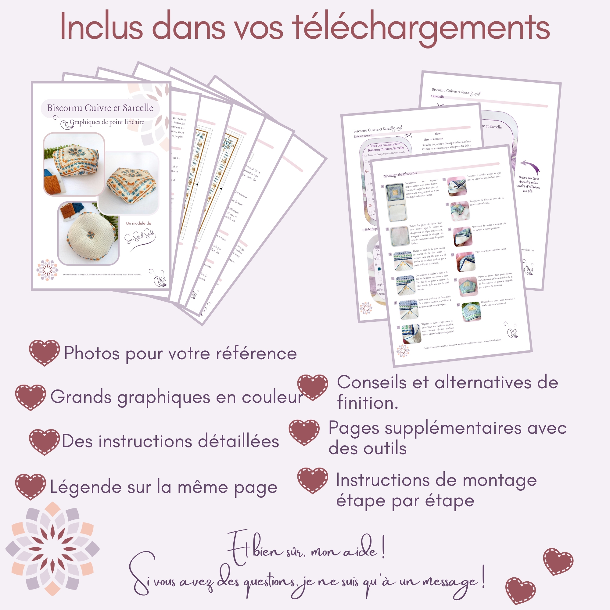 – Instrucciones para realizar los puntos especiales y para ensamblar el biscornú con fotografías para guiarle durante el proceso.