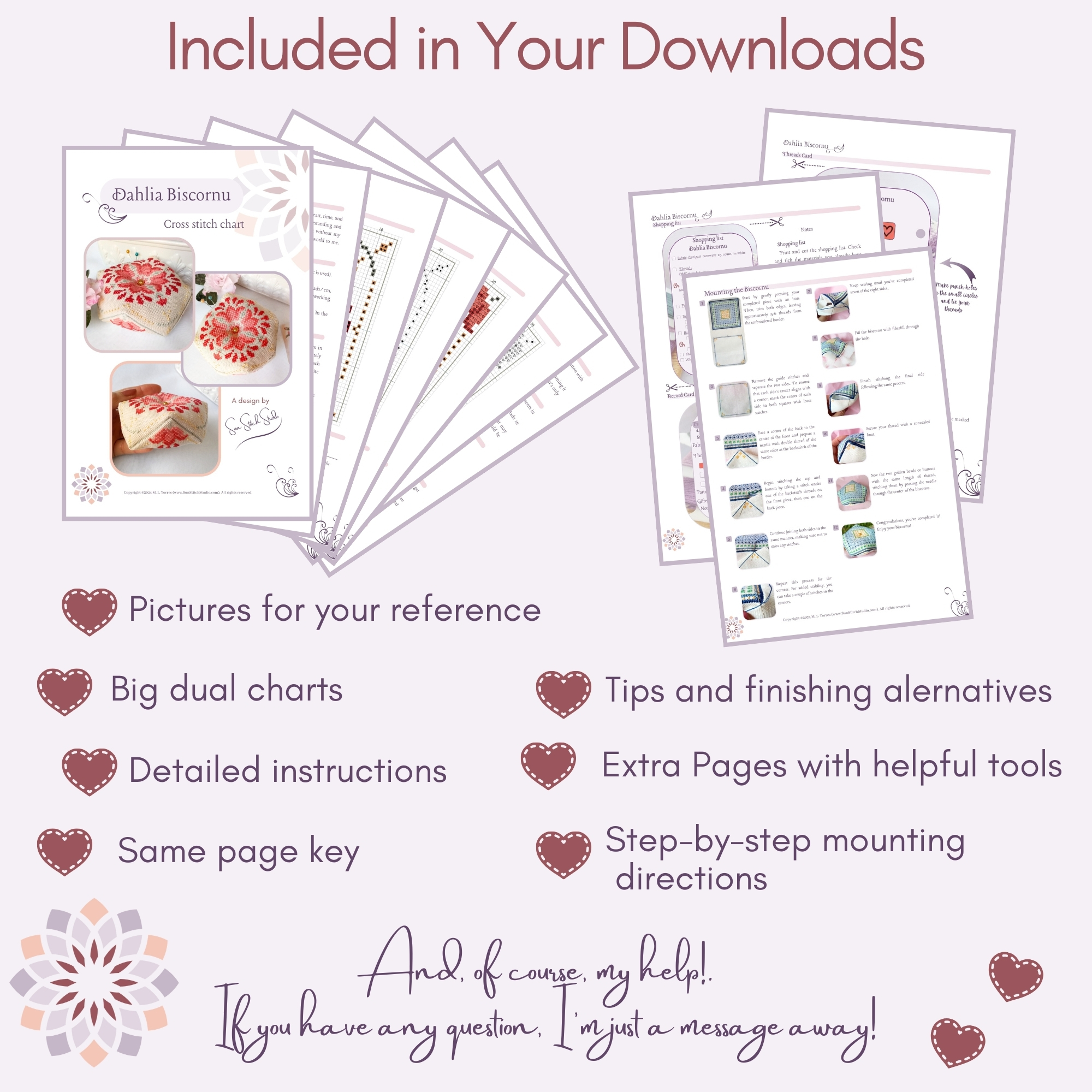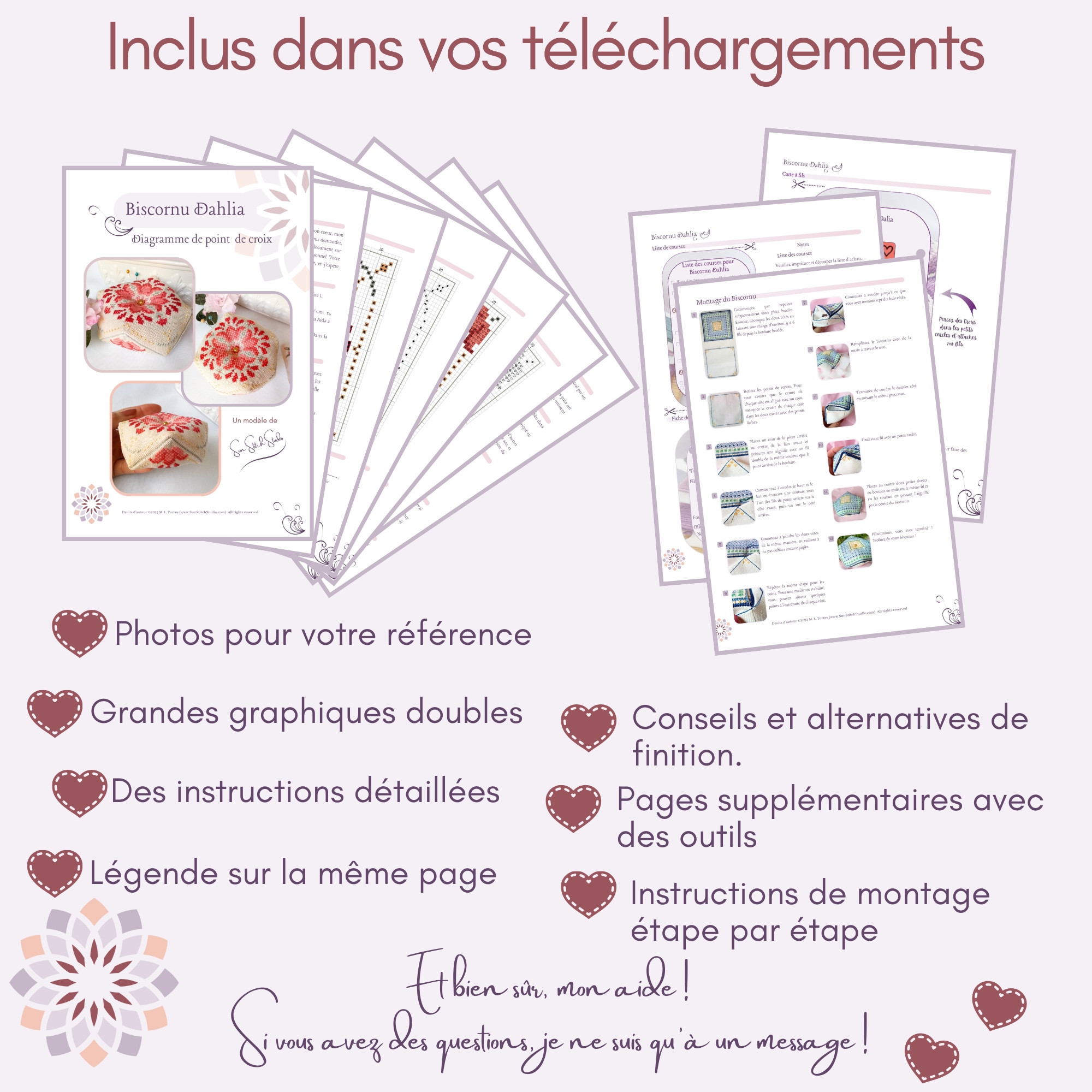 Este producto es un patrón digital en formato PDF con todas las instrucciones necesarias para bordar y montar el Biscornú Dalia. No es un producto terminado.