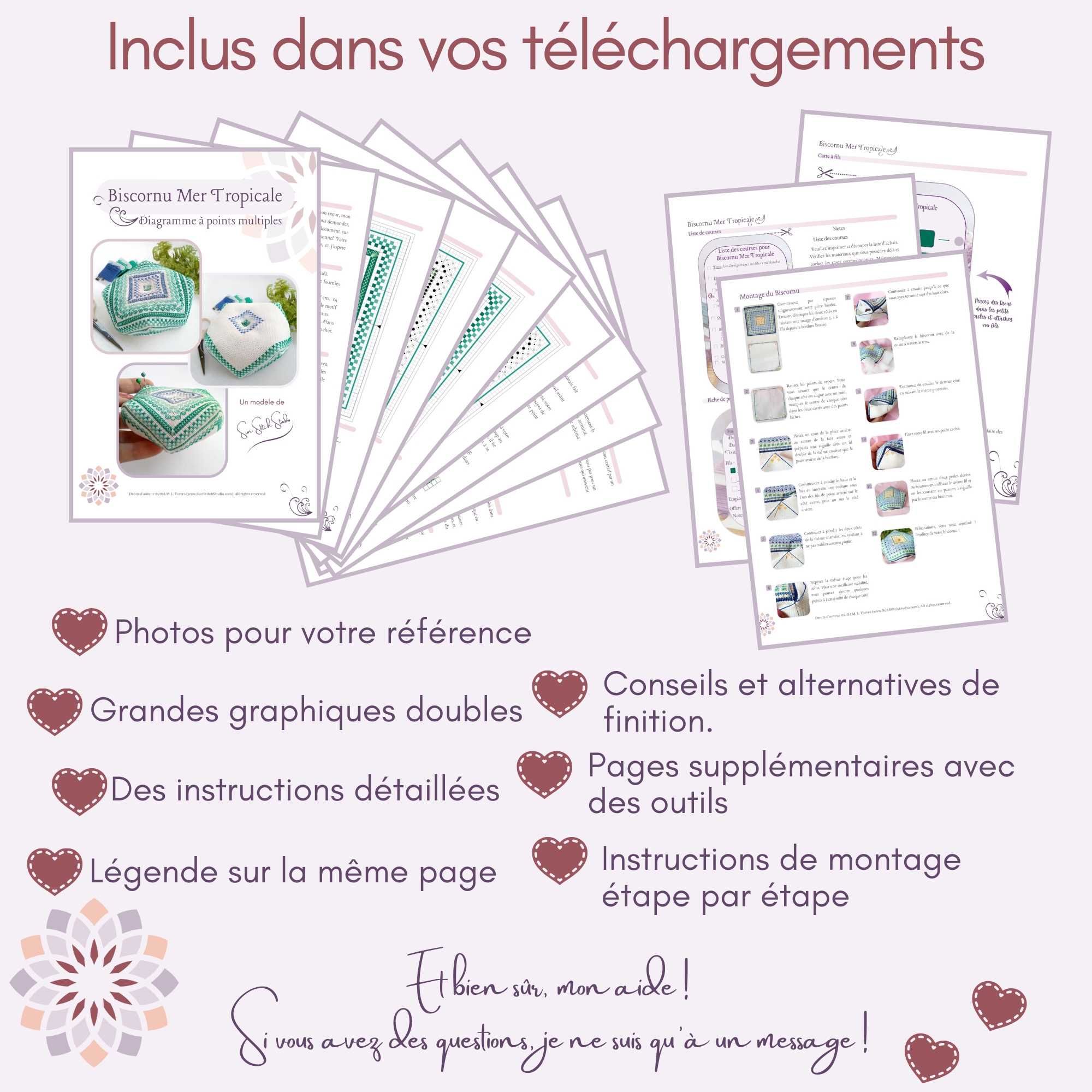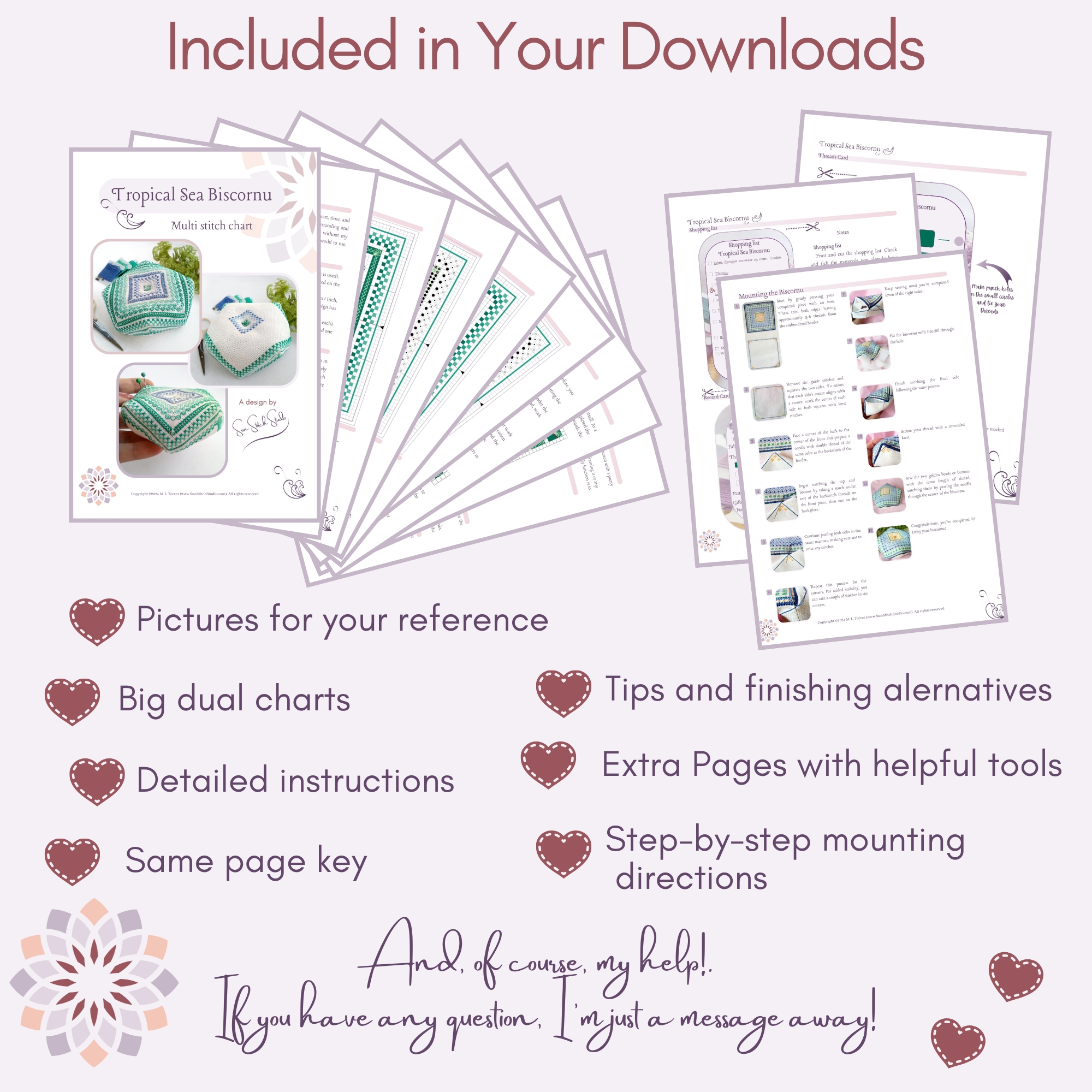 – Los patrones están protegidos por leyes de propiedad intelectual y son solo para uso personal. No se permite compartir, copiar o subir este gráfico a internet. Puede vender el biscornú terminado siempre que reconozca la fuente: Sun Stitch Studio (M. L. Torres -(www.SunStitchStudio.com).