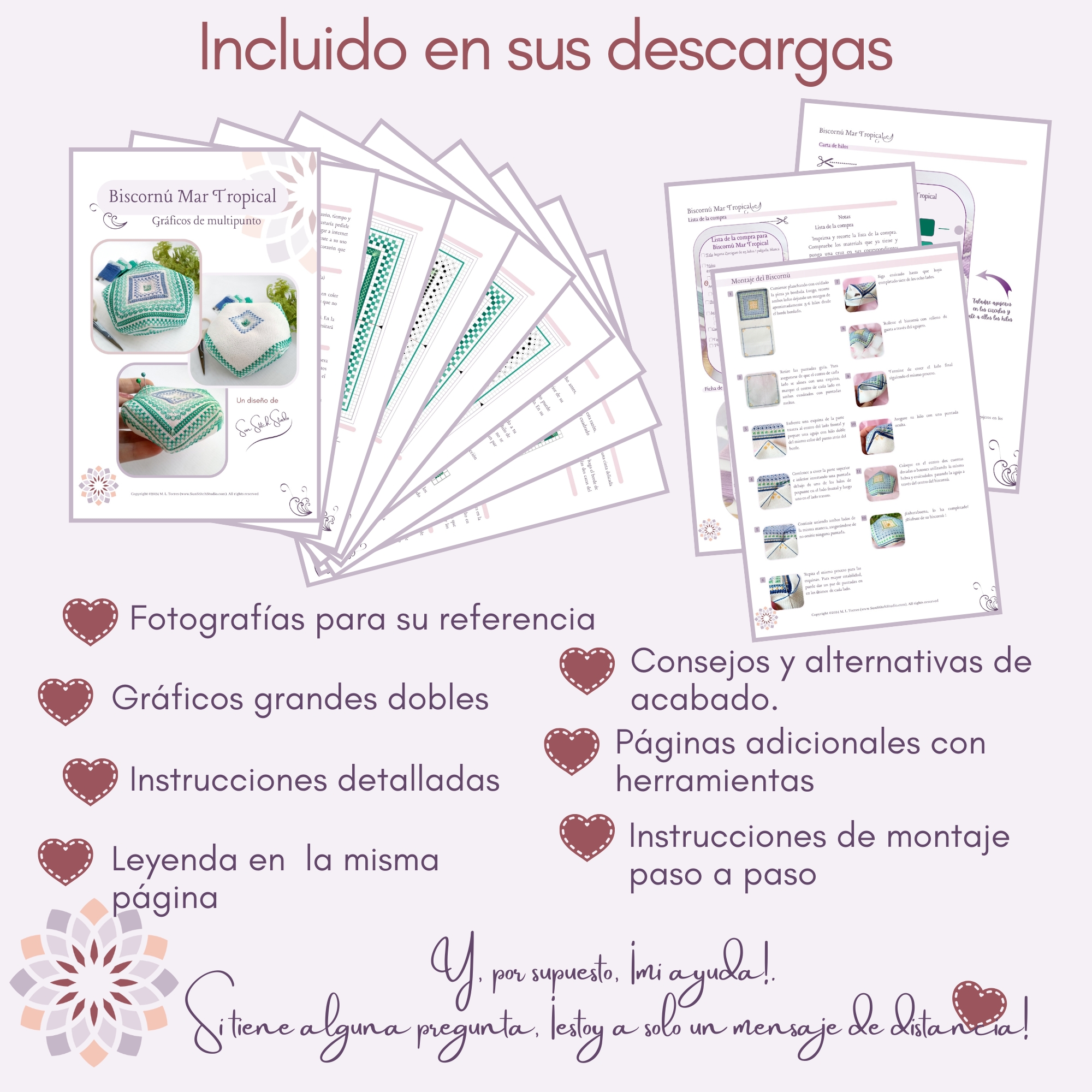 – Descripción, lista de materiales e instrucciones sobre cómo bordar el diseño.