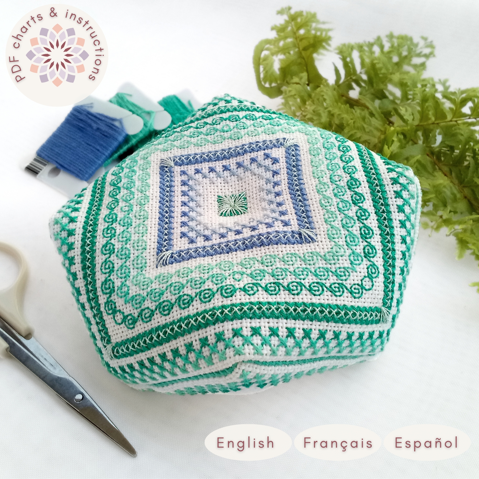 Este artículo consiste en un grupo de archivos PDF con el patrón de punto de cruz para el Biscornú Mar Tropical e instrucciones para realizar el biscornú , NO el producto terminado. No incluye tela, hilos ni otros materiales. El biscornú terminado mostrado en las imágenes tiene solo fines ilustrativos del alfiletero terminado.